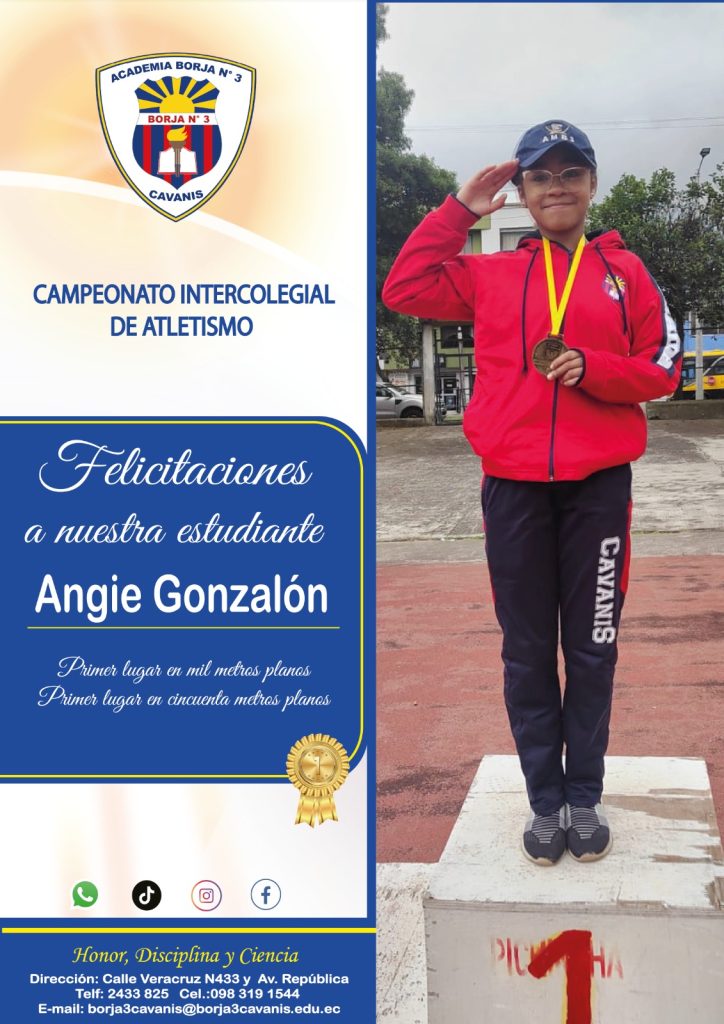 La Unidad Educativa Academia Borja 3 Cavanis felicita con gran orgullo a la cadete Angie Gonzalón por haber alcanzado los primeros lugares en las competencias de 1000 metros planos y 50 metros planos, demostrando un alto nivel de rendimiento, disciplina y espíritu deportivo.
